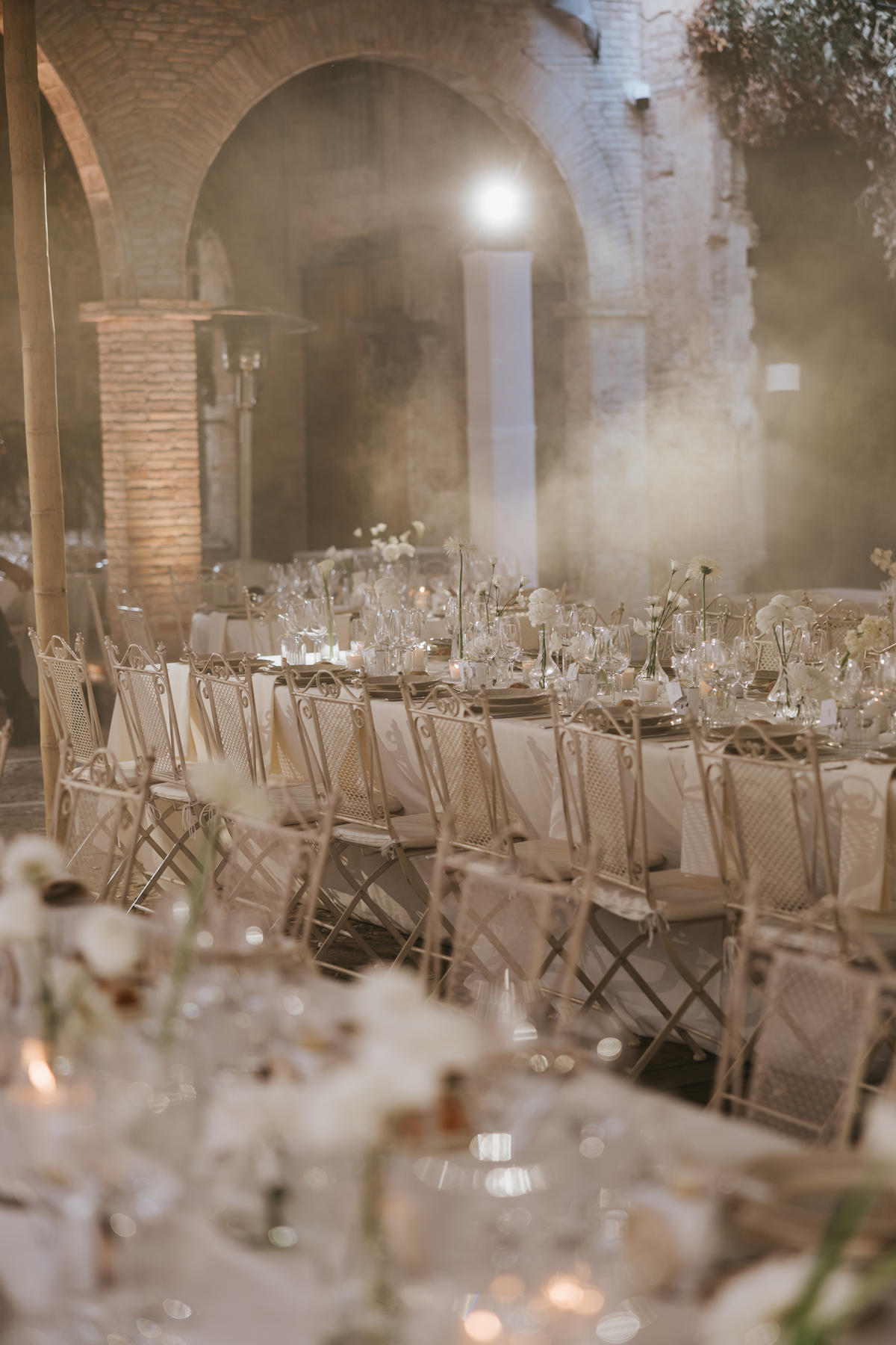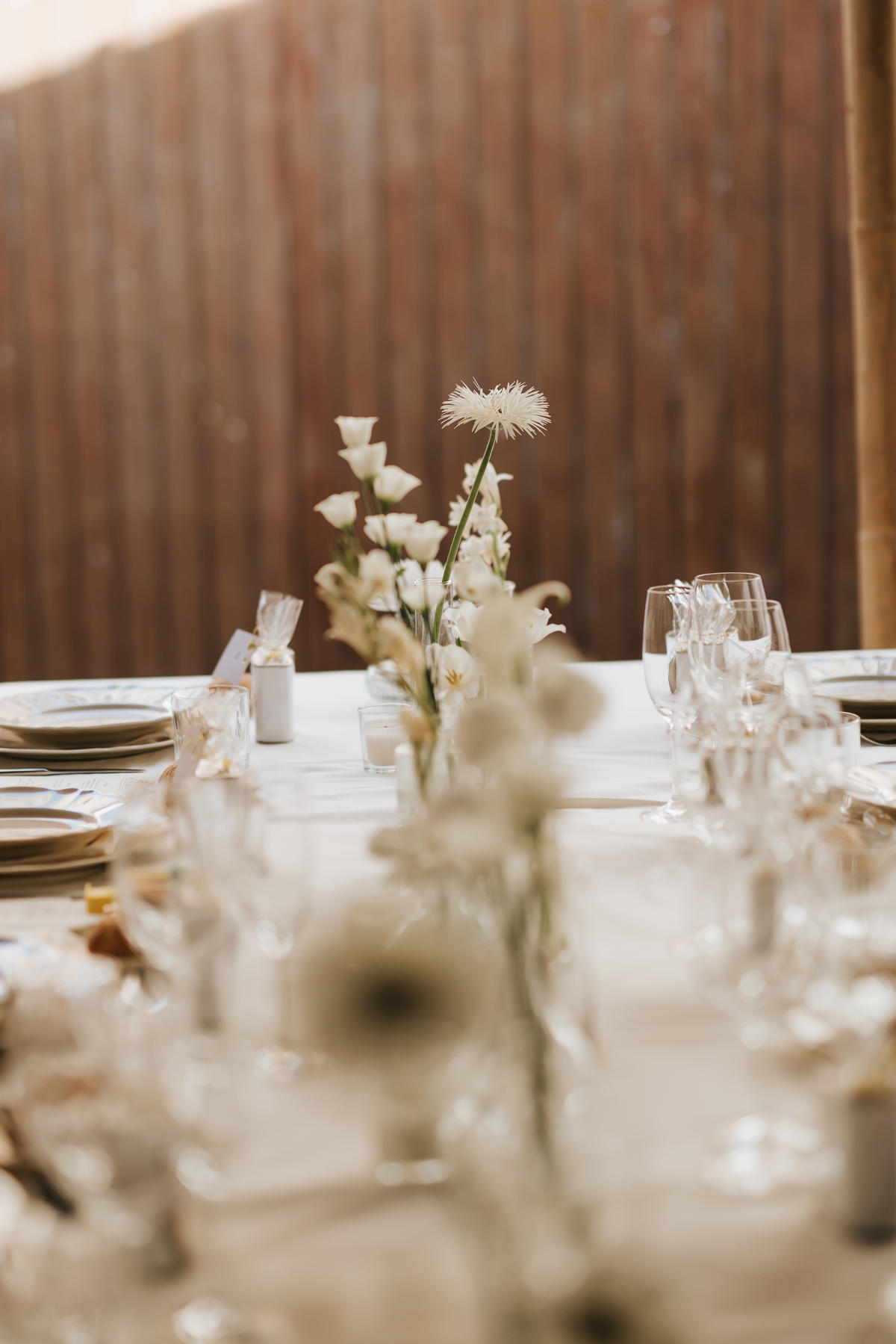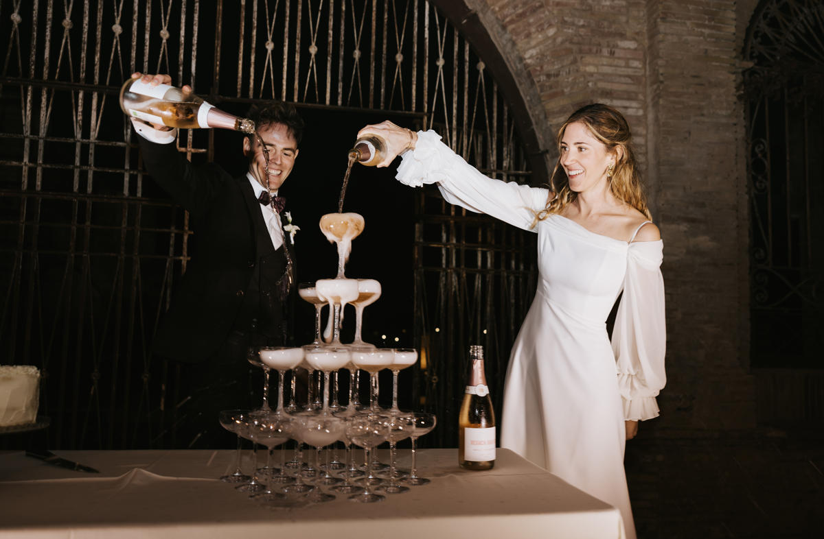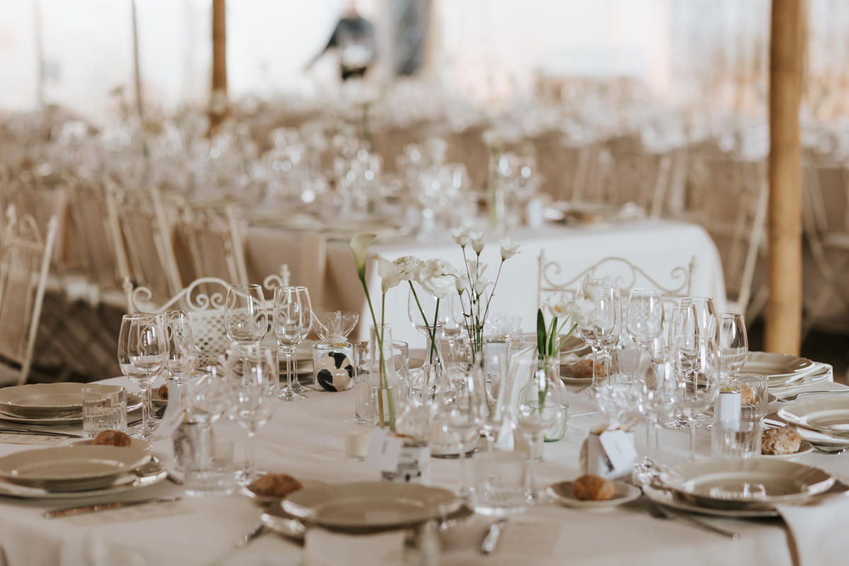 Para el banquete, las mesas con jarrones de cristal y delicadas flores blancas añadían un toque fresco y sofisticado. Pero si algo marcó la diferencia fue la fiesta… ¡Y vaya fiesta! La pista de baile se llenó de energía y risas.