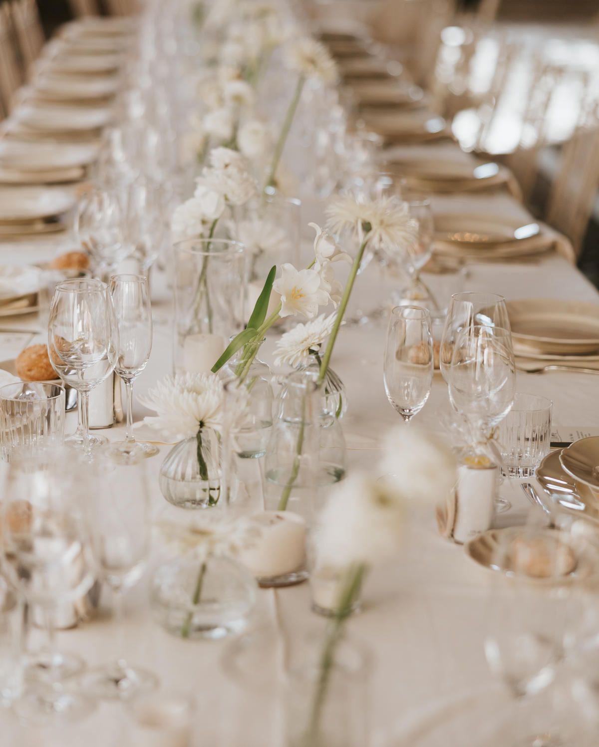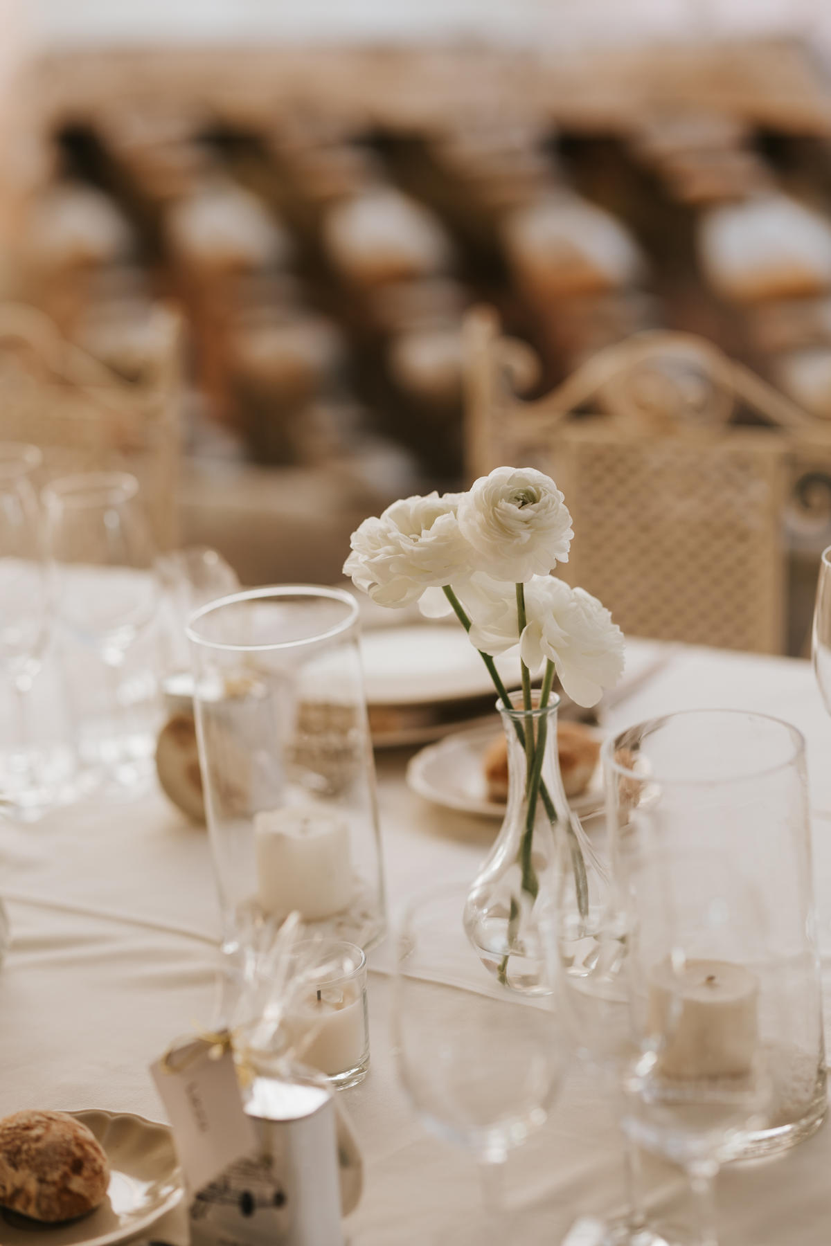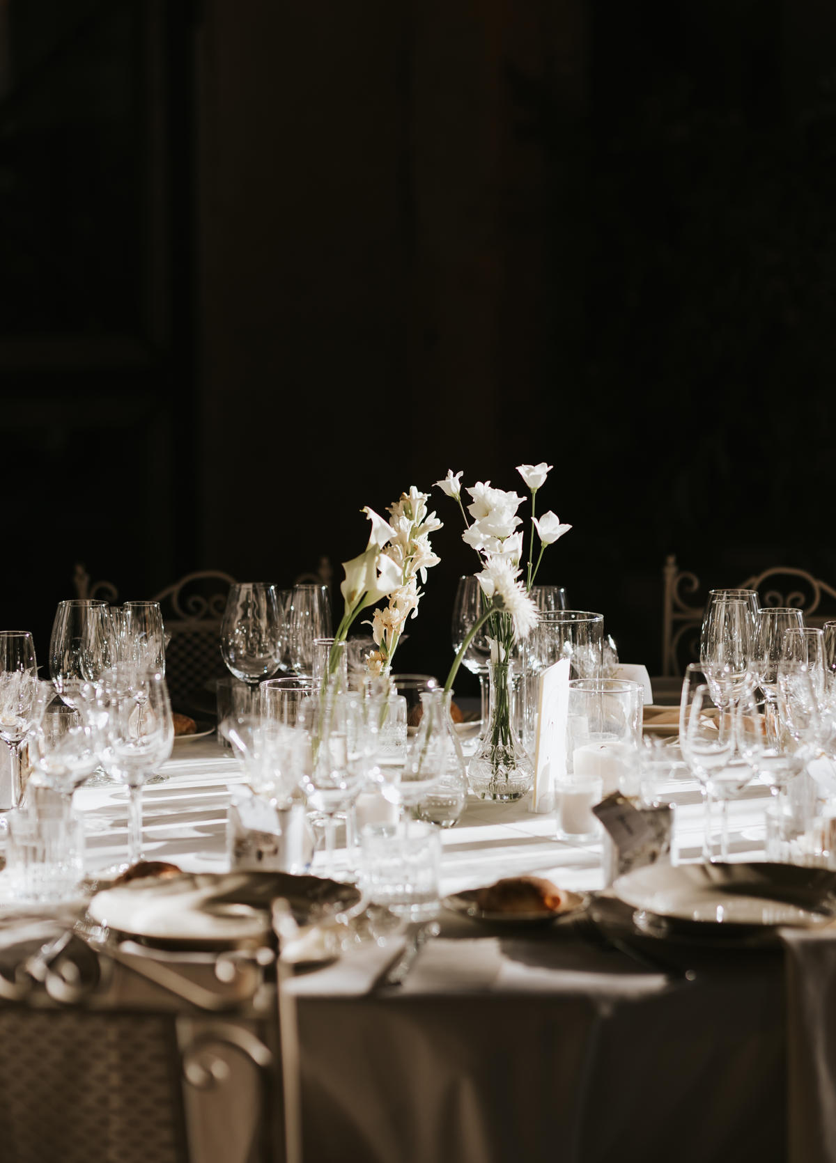 Para el banquete, las mesas con jarrones de cristal y delicadas flores blancas añadían un toque fresco y sofisticado. Pero si algo marcó la diferencia fue la fiesta… ¡Y vaya fiesta! La pista de baile se llenó de energía y risas.