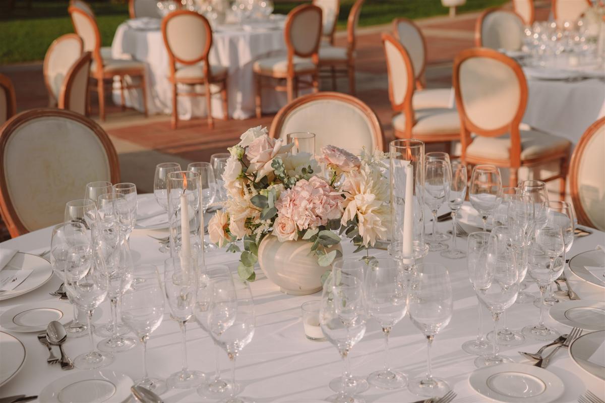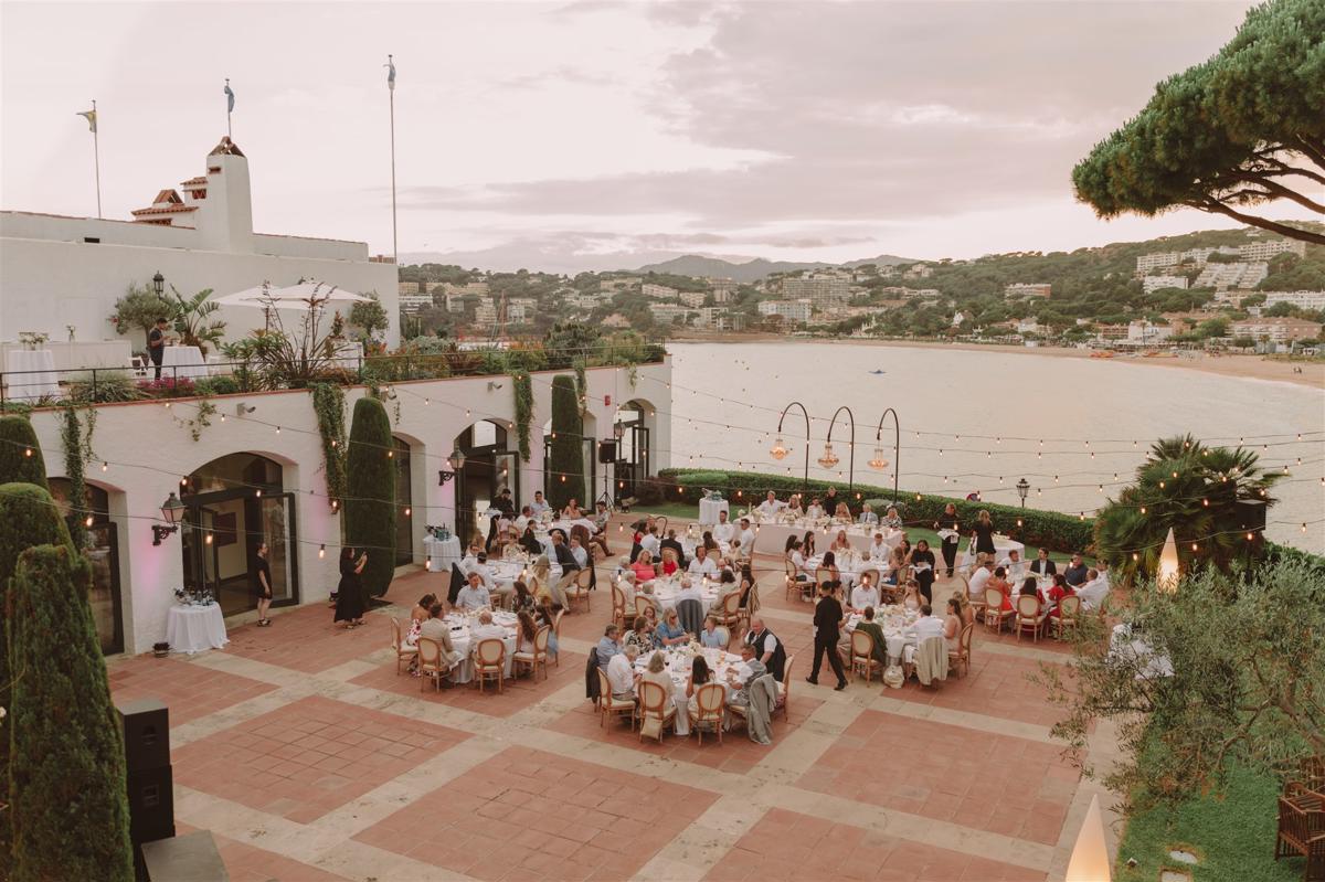 El banquete en el exclusivo Hostal de la Gavina ofrecía unas vistas impresionantes al mar, creando un ambiente mágico. La decoración en tonos pastel y blanco, con jarrones de cerámica y velas cónicas, aportaba sofisticación y calidez. Como broche de oro, la mesa presidencial alargada brillaba bajo la luz de tres impresionantes lámparas de cristal. Una boda llena de encanto, estilo y momentos inolvidables.