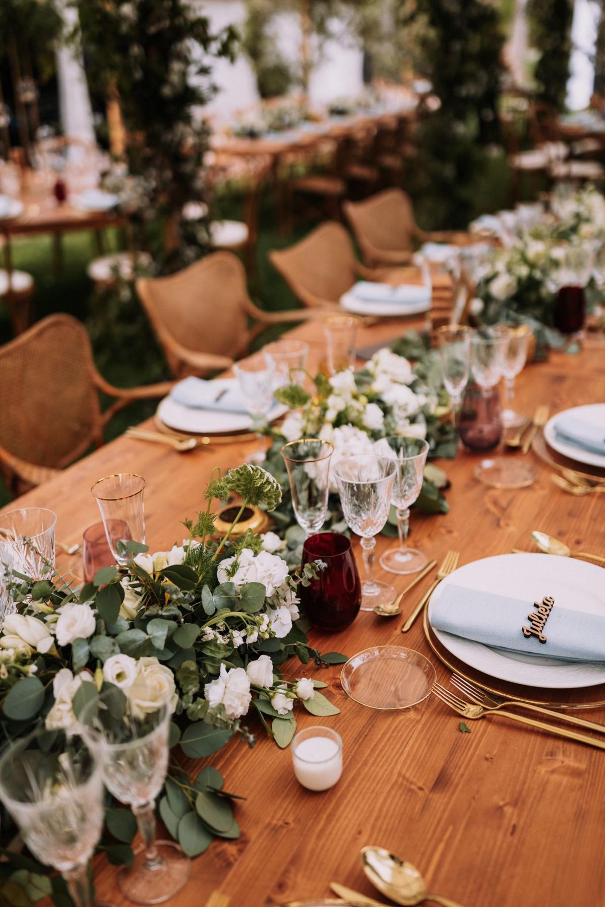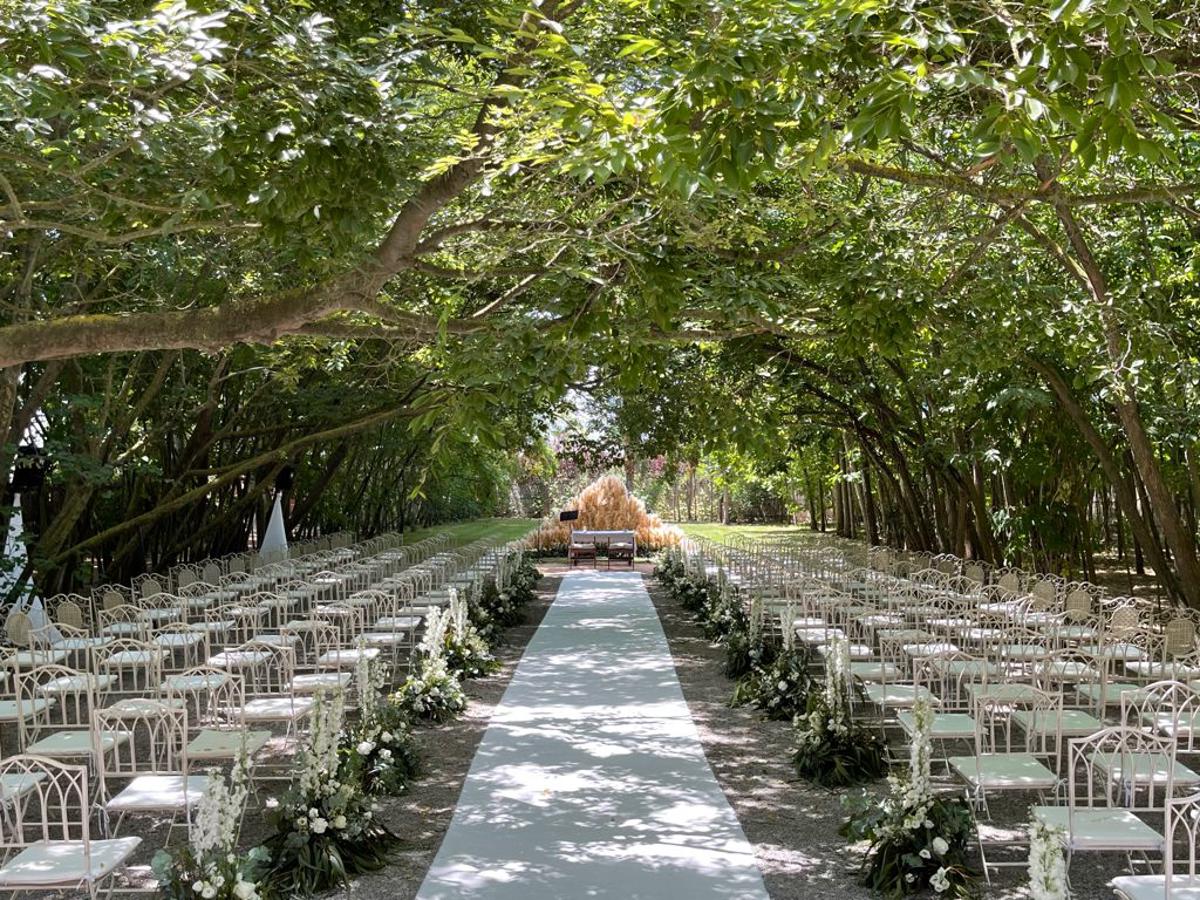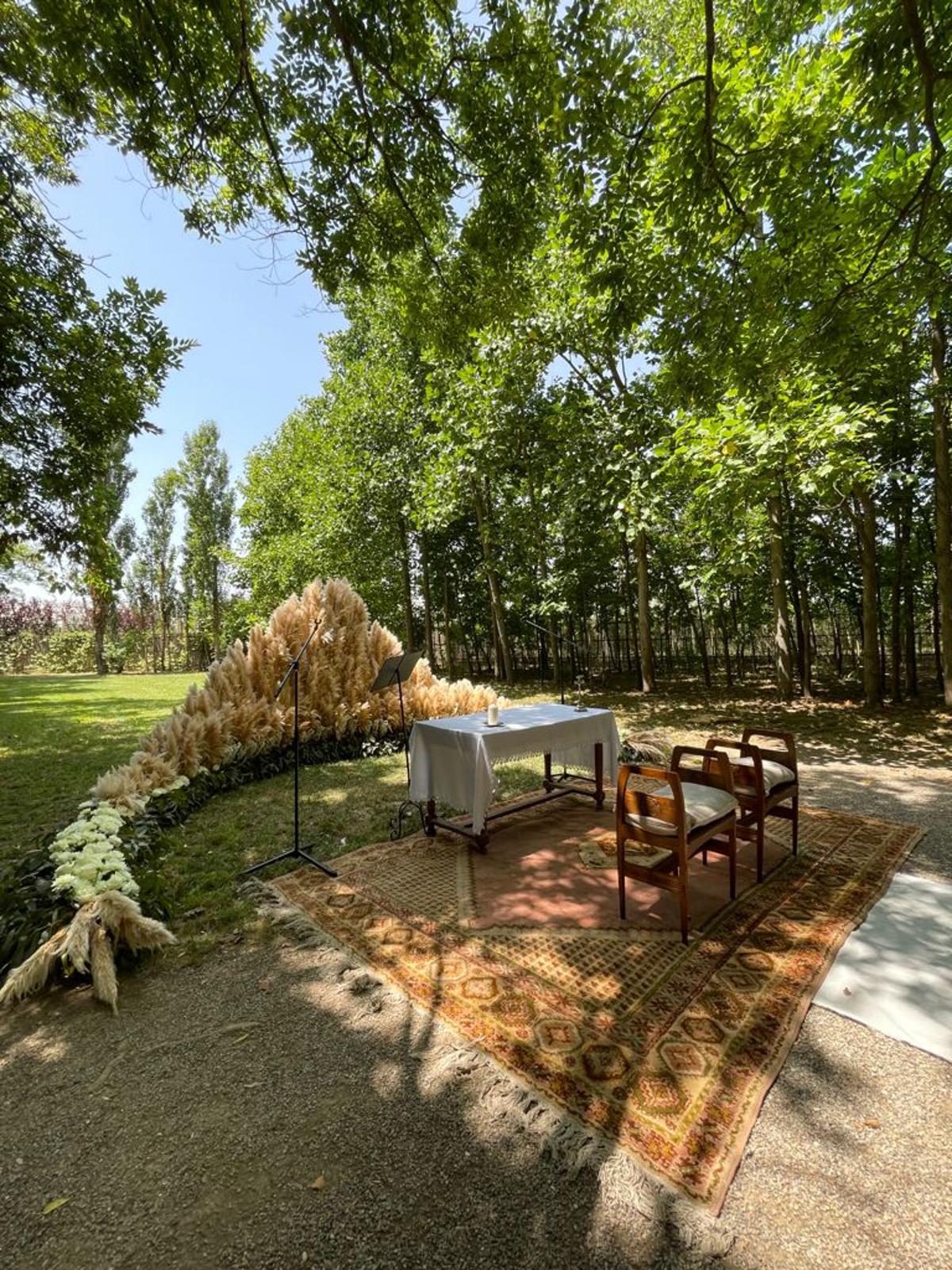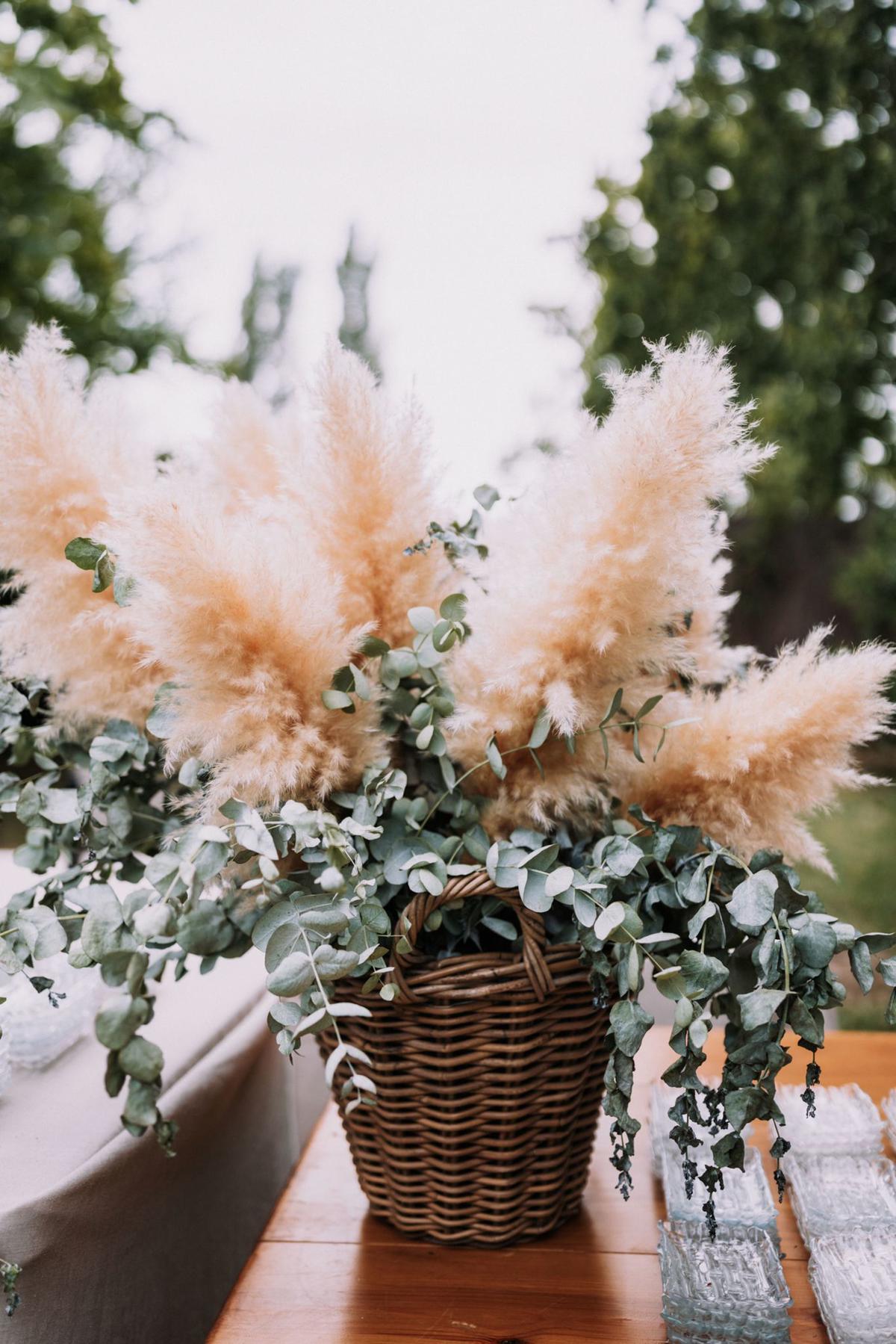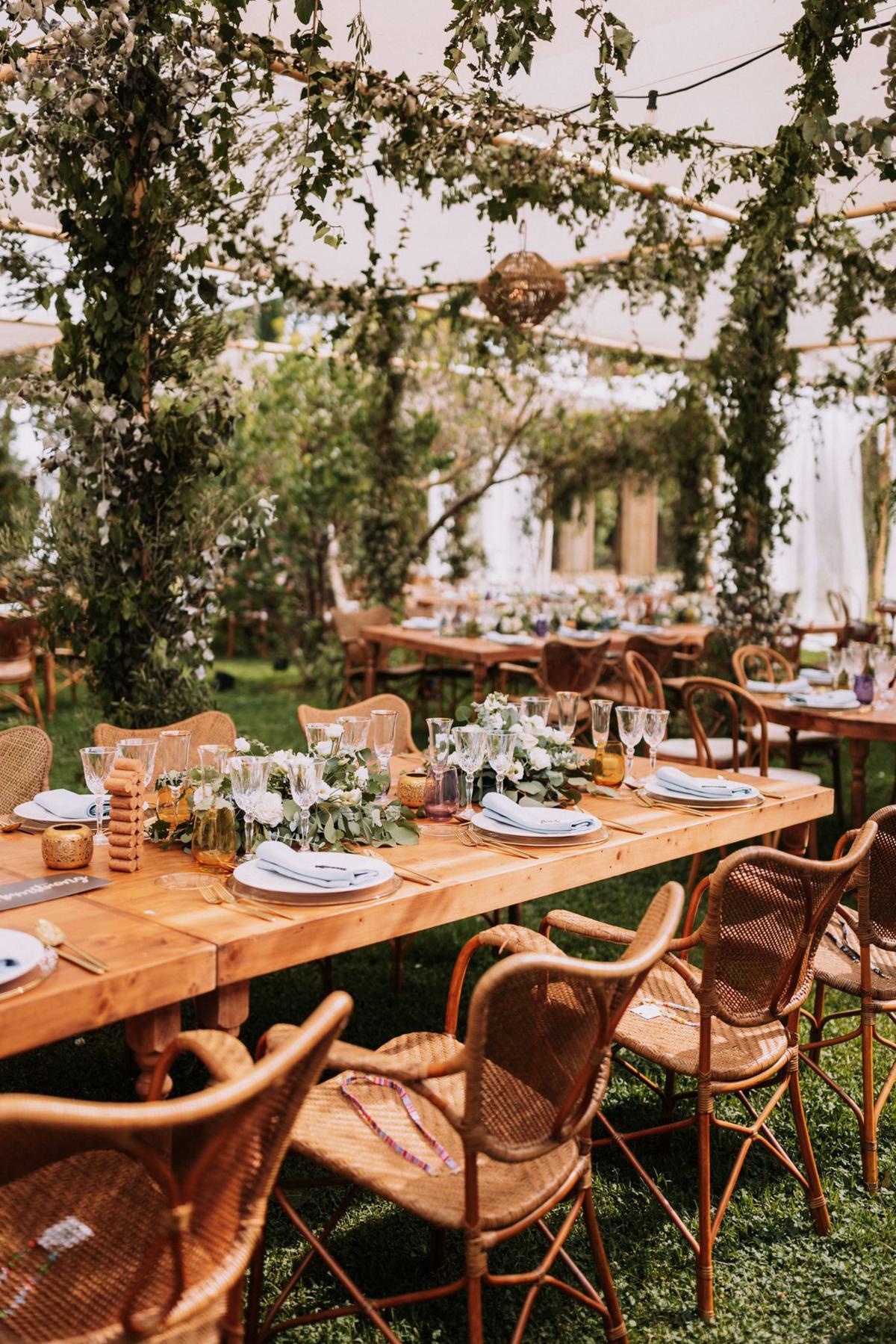 La ceremonia, con un altar cubierto de pampa y un pasillo florido, tenía un aire natural y romántico. Para el banquete, una carpa llena de verdes creaba un ambiente acogedor y mágico, combinando diferentes centros de mesa y mucha madera para darle calidez y personalidad.